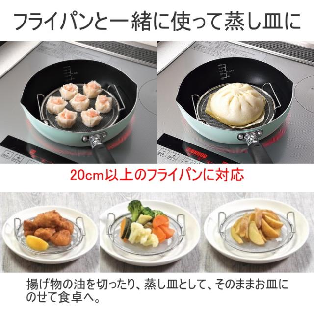 お手持ちのフライパンや鍋で手軽に蒸し料理ができます。 揚げ物の油切りとしても使えます。 お皿に乗せてそのまま食卓へ。 20cm以上のフライパンに対応。 |