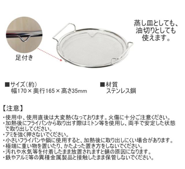 ・使用中、使用直後は熱くなりますのでご注意ください。 ・加熱後にフライパンから取り出す際はミトン等を使用し、両手で安定した状態で取り出してください。 ・アミを強く押さないでください。 ・小さいフライパンや鍋に使用すると、加熱後に取り出しにくい場合があります。 ・極端に重いものを置いたり、かたよった置き方をしないでください。 |