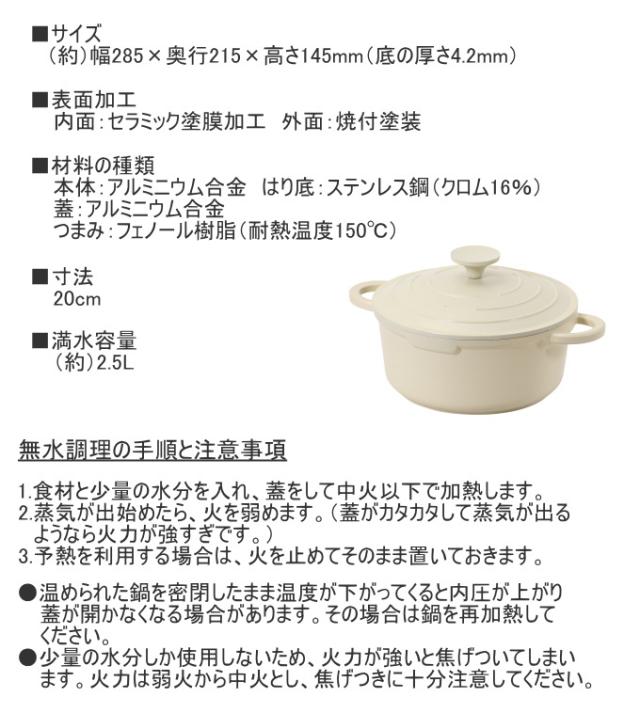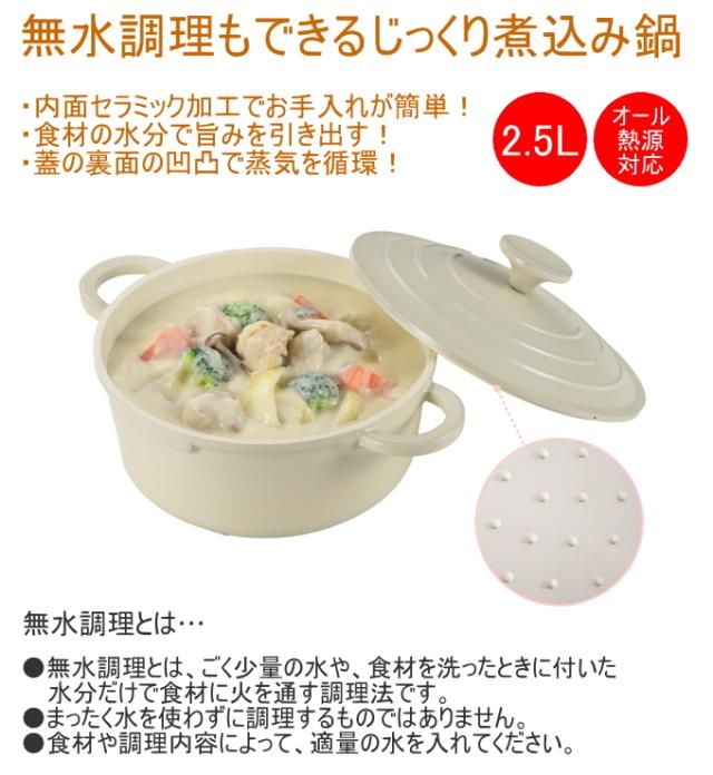 無水調理もできるじっくり煮込み鍋。 内面セラミック加工でお手入れ簡単。 食材の水分で旨みを引き出し、おいしさを逃さない構造。 蓋の裏面の凹凸で蒸気を循環させ、水滴が落ちやすい形状。 オール熱源対応。 ※無水調理をする際は、火力はごく弱火にしてください。こげつく原因になります。 ※塗膜保護のためにも火力は中火以下で使用してください。 ※つけ置き洗い、食器洗い乾燥機には使用しないでください。 |