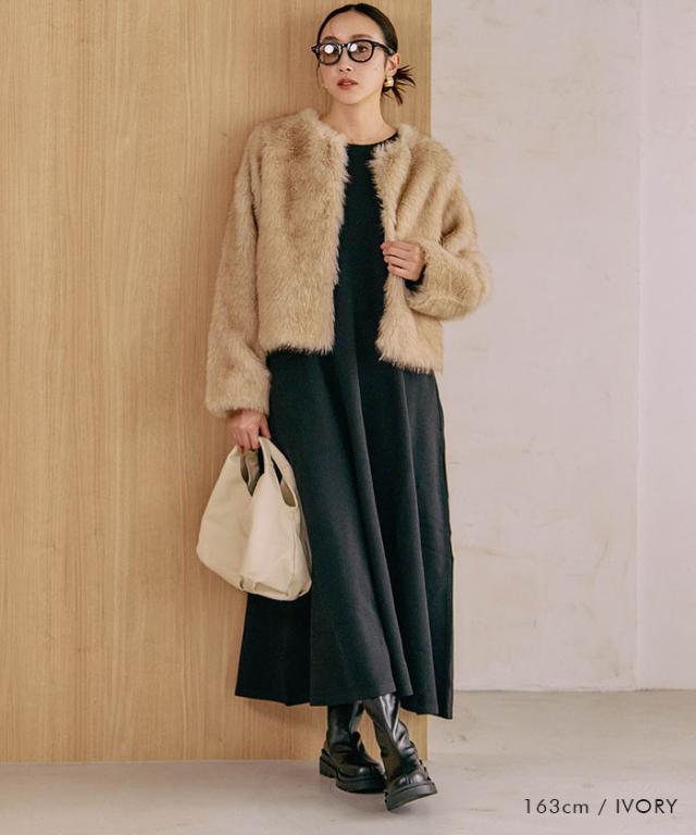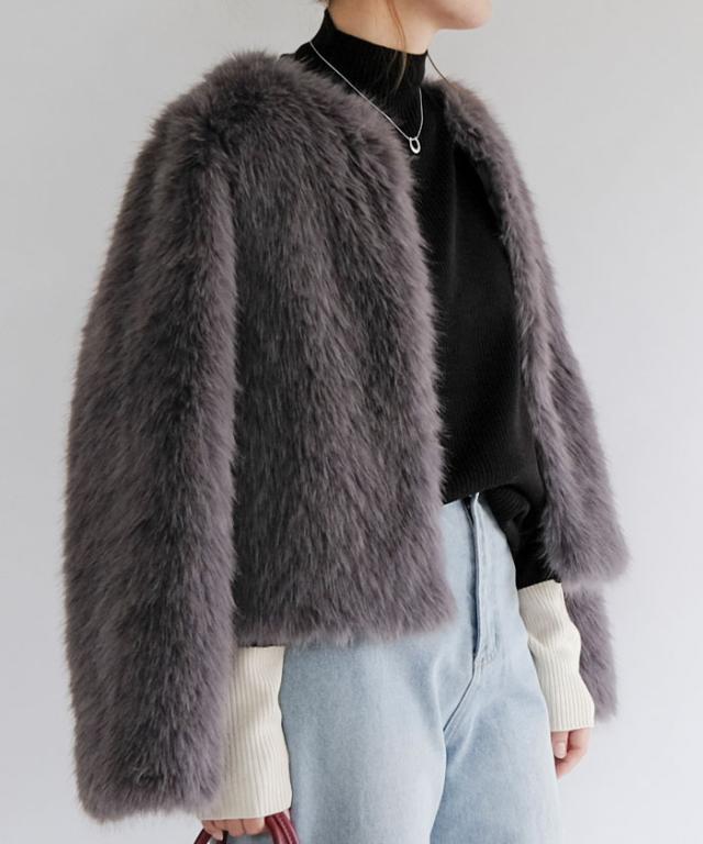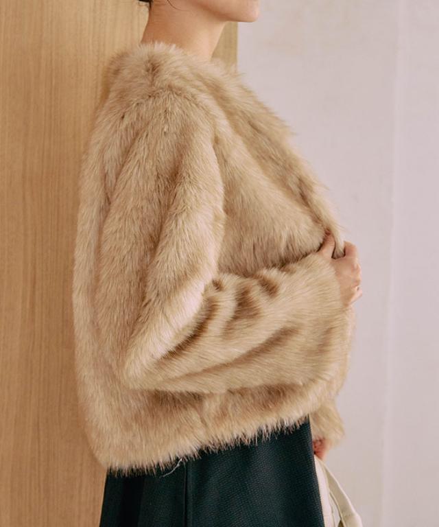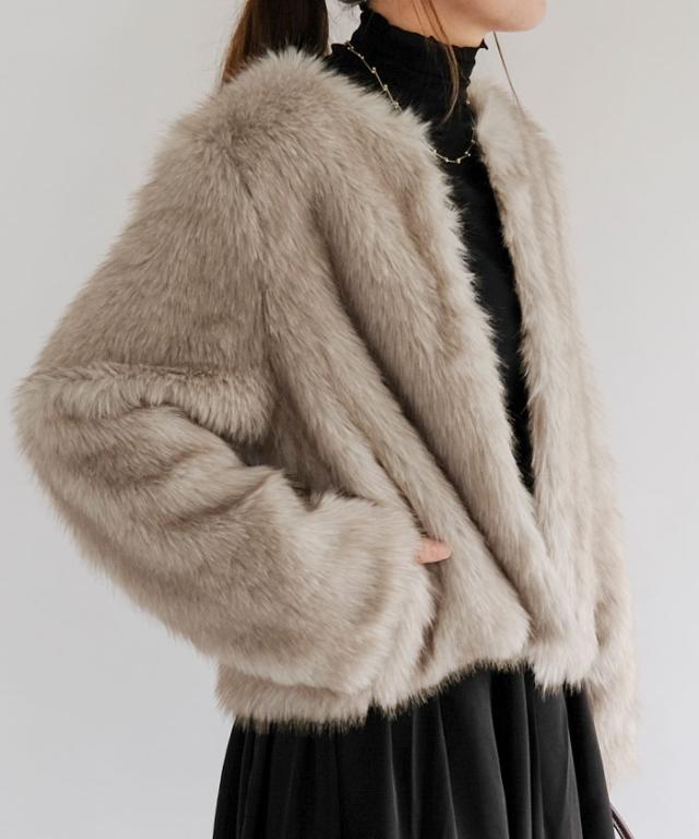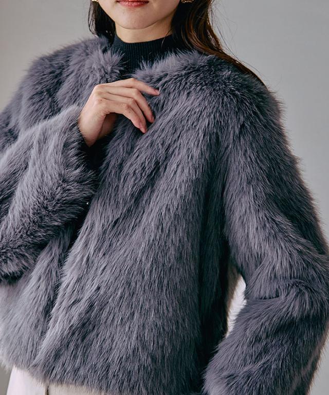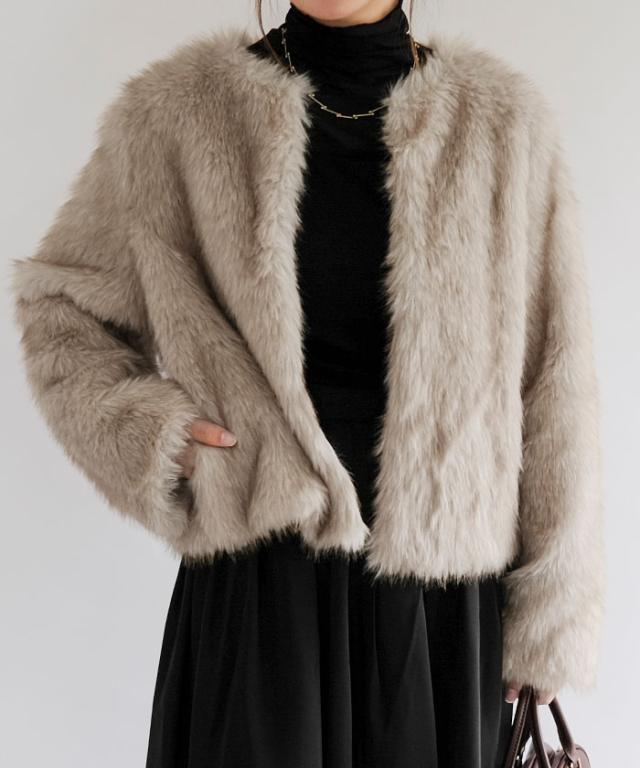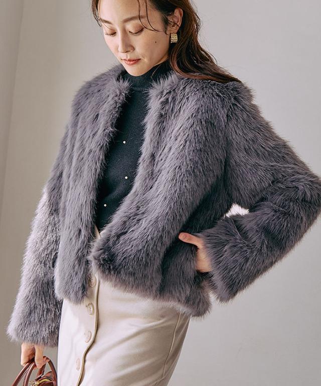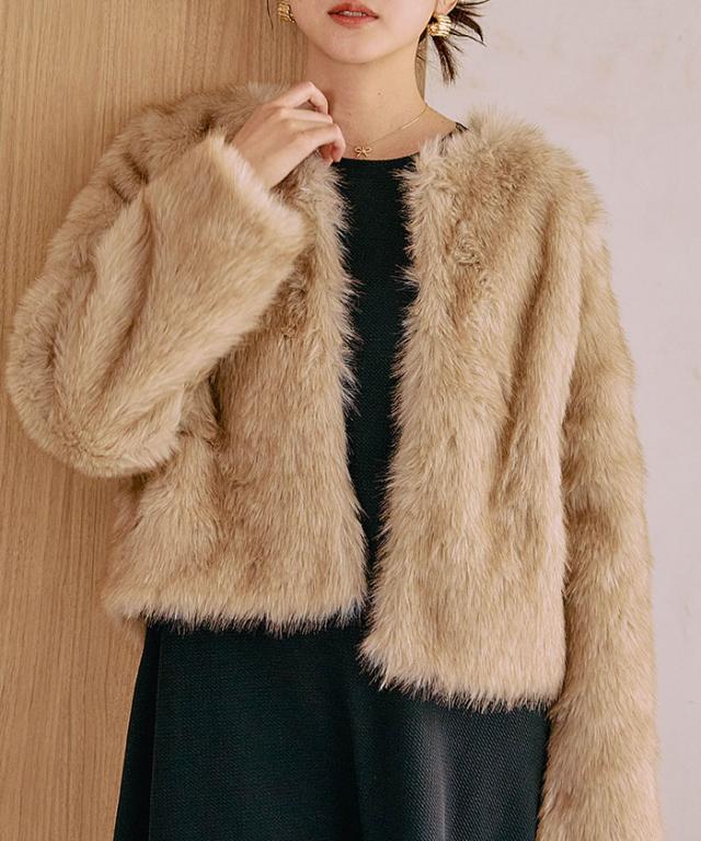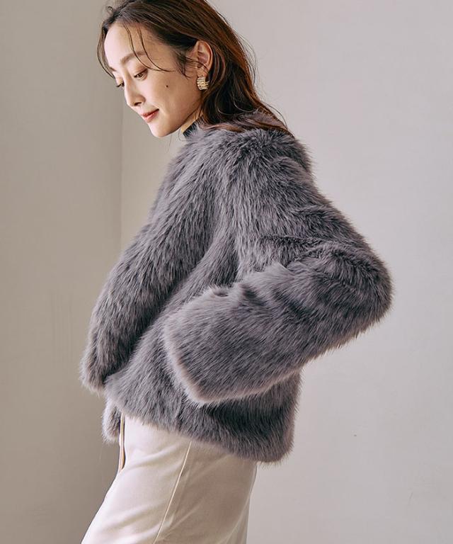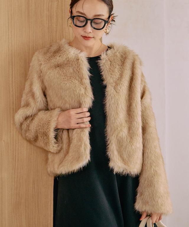 ふわふわとした質感が魅力のノーカラーファージャケット。