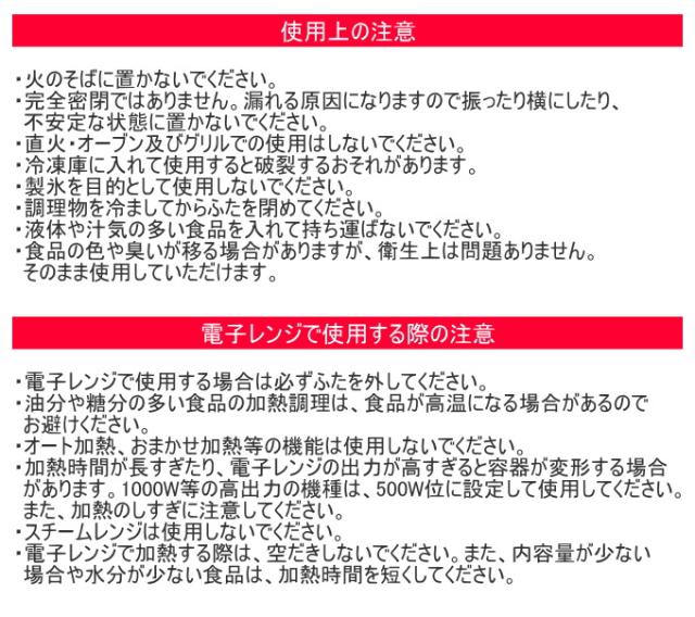 本体:ポリプロピレン(耐熱温度140℃/耐冷温度-20℃) 蓋:ポリプロピレン・熱可塑性エラストマー(耐熱温度100℃/耐冷温度-20℃) 押し型:ポリプロピレン(耐熱温度100℃/耐冷温度-20℃) |