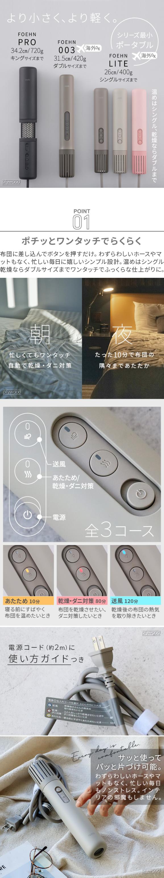 “空気をデザインする”ブランド、cadoの世界最小級ふとん乾燥機が、さらに小さくなって「FOEHN LITE(フェーンライト)」として登場。このスティックを布団に挿し込むだけで、ふっくらさらさらな快眠環境がつくれます。シーツやふとんカバーをつけたまま、羊毛、羽毛、綿、化学繊維などのふとん乾燥・あたためが可能です。海外電圧にも対応しているから、渡航先で心配なトコジラミへの対策として1台持っていると安心です。
