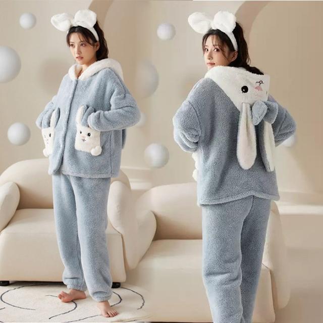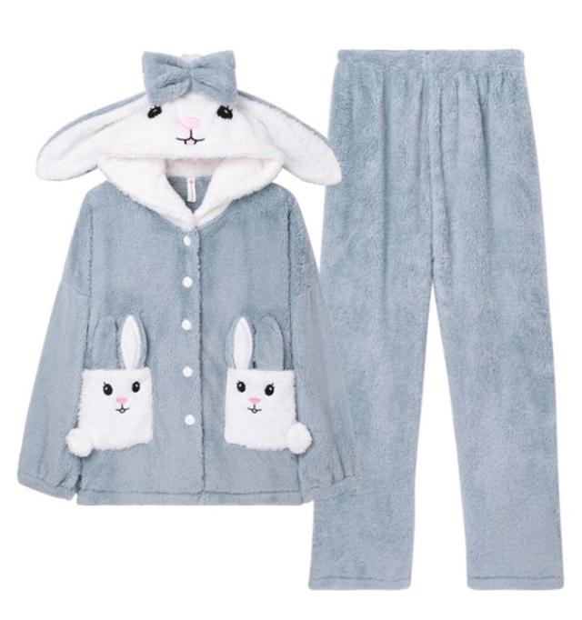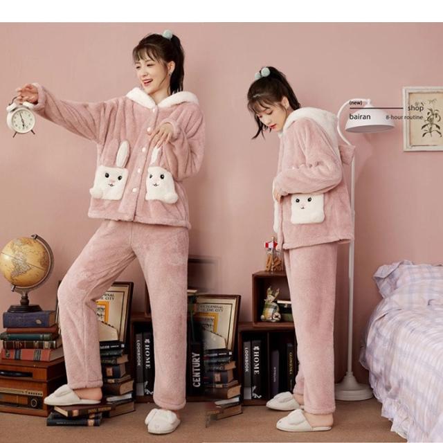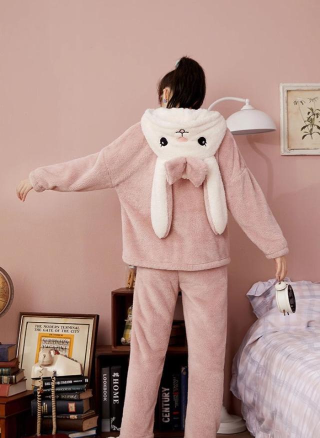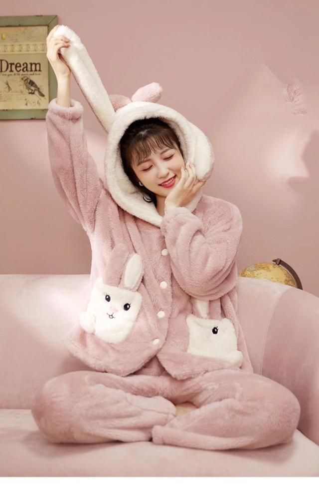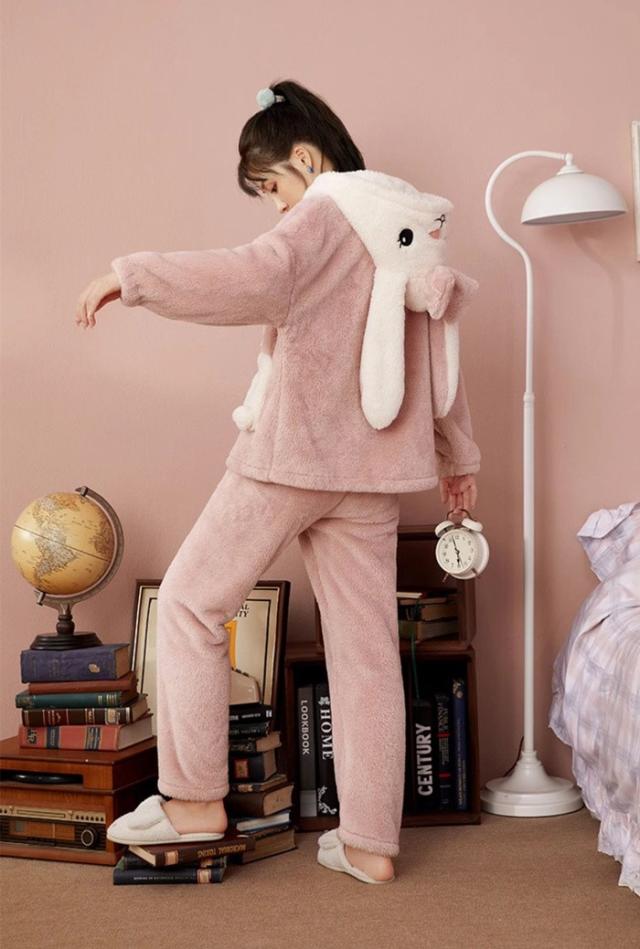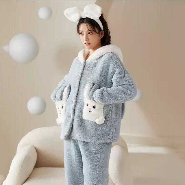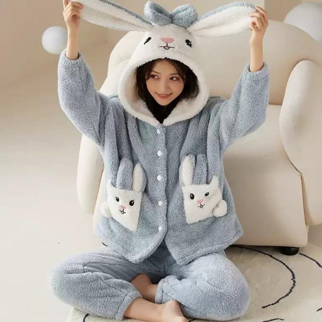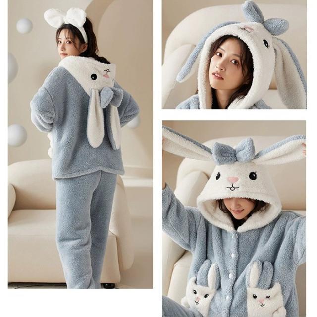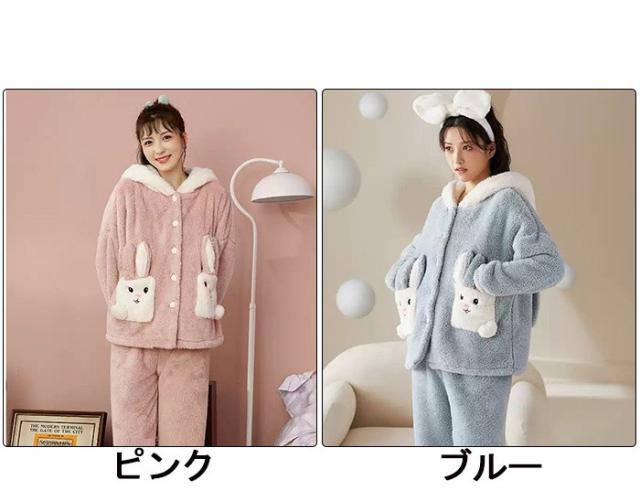 ルームウェア レディース もこもこ パジャマ ウサギ耳フード付き 長袖 トップス ズボン 着る毛布 大きいサイズ 前開き 寝巻き 部屋着 あったか 暖かい モコモコ ふわふわ 女性用 かわいい ギフト