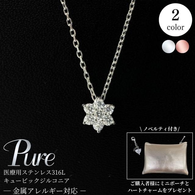 金属アレルギーを誘発しにくい、敏感肌に優しい最高位の医療用ステンレス316Lに、AAAクラスのキュービックジルコニアをあしらったフラワーネックレス。