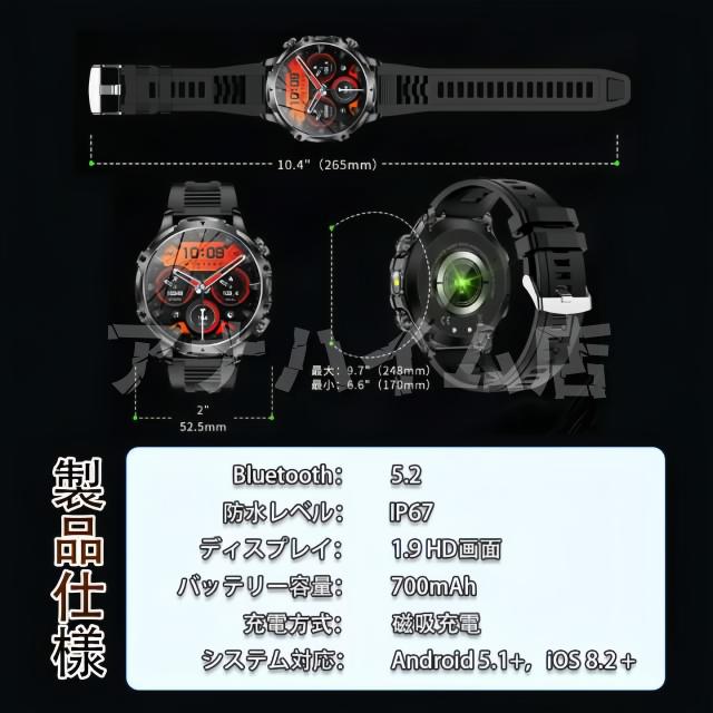 ・カラー:黒三株、銀三株 ・形状:円形 ・画面サイズ:1.9 インチ ・対応機種:Android5.1+、iOS8.2+ ・防水性:IP67 ・商品の重量:150g ・接続方式:Bluetooth ・サイズ:男性基準(調整可能) ・連続使用可能時間7日 ・その他 機能:LED懐中電灯、1.9インチ高品位タッチディスプレイ、天気予報、ストップウォッチ、歩数計、タイマー、音楽制御、輝度調整、検索電話, 目覚まし時計、カメラ制御、計算機、飲料水注意、長居注意、邪魔しないモード、100種類以上のスポーツモード、フィットネストラッカー、カロリー、受信/電話、メッセージ通知、多言語、IP 67防水 |
