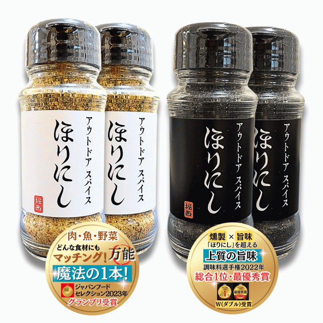ほりにし アウトドアスパイス 2種セット 万能スパイス 燻製 肉・魚・野菜 何でも合う アウトドア 調味料 スパイス ギフト BBQ バーベキュー キャンプ 白 黒 各2本 合計4本