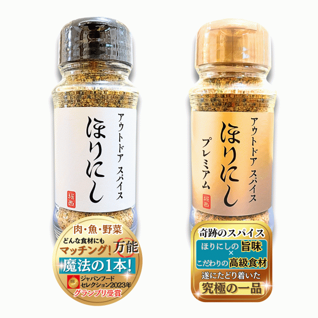 ほりにし アウトドアスパイス 2種セット 万能スパイス プレミアム 究極の一品 肉・魚・野菜 何でも合う アウトドア 調味料 スパイス ギフト BBQ バーベキュー キャンプ 白 金 各1本 合計2本