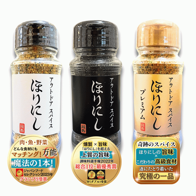 アウトドアスパイスほりにし(白)、ほりにしプレミアム(金)、ほりにし燻製ブラック(黒)の3種類をお楽しみいただけるセットです。