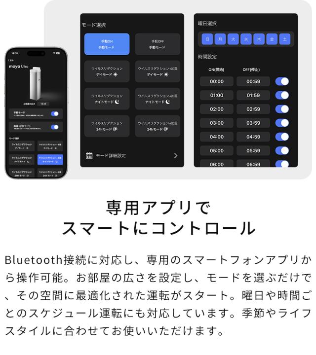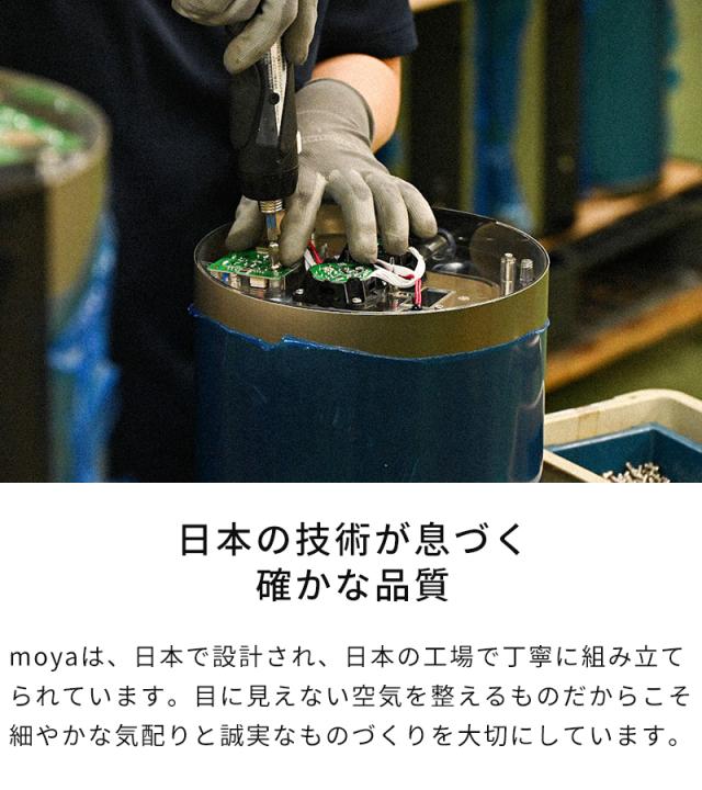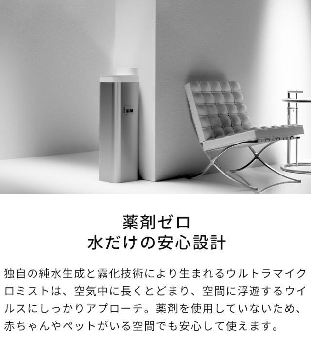 水道水からつくる純水ミストで加湿しながら、空間のウイルスを99.9%減少させる「moya Ultra」。 最大1,600mL/hの圧倒的な加湿力と、0.05〜0.5μmのウルトラマイクロミストにより、さらりと心地よい潤いを届けます。薬剤を一切使わないため、赤ちゃんやペットのいる空間にも安心。Bluetooth対応アプリで自動運転やスケジュール設定も可能です。洗練されたステンレスの佇まいがインテリアに溶け込む、moyaシリーズの最上位モデルです。