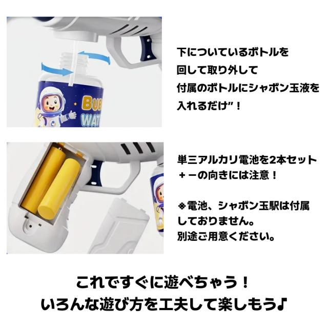 ※シャボン玉液、電池は付属しておりません。別途ご用意が必要になります。