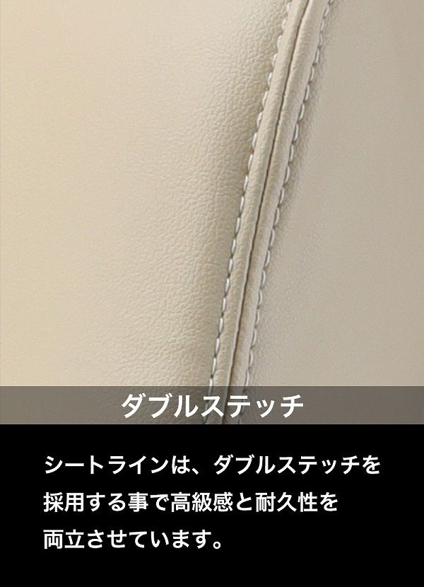 特徴のある3つのダブルステッチセンター部、サイド部、シート縫製ラインセンター部の縦ダブルステッチがシート全体を引き締め、サイド部にWhipラインを入れることにより上品でスタイリッシュなデザインに仕上げました。またシート縫製ラインにもダブルステッチを採用し強度を高めています。