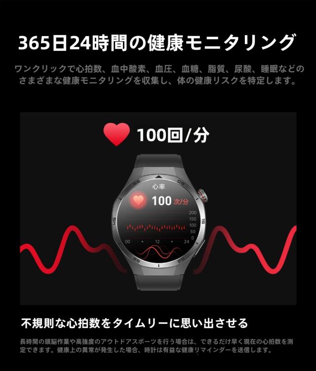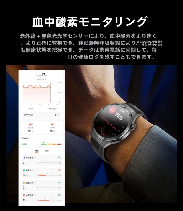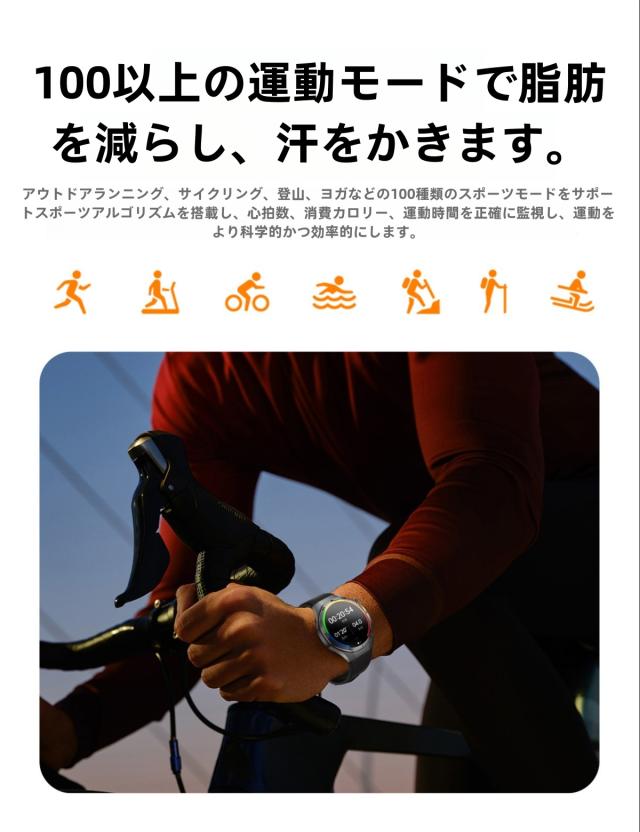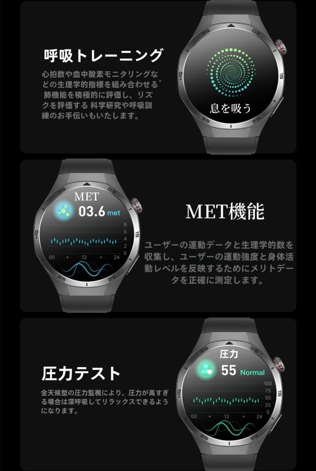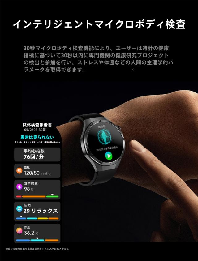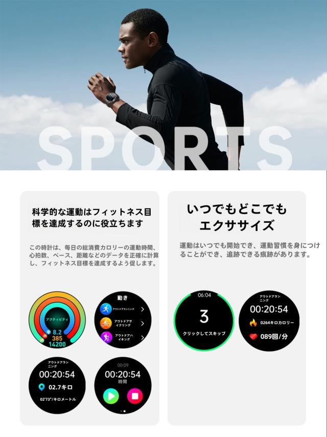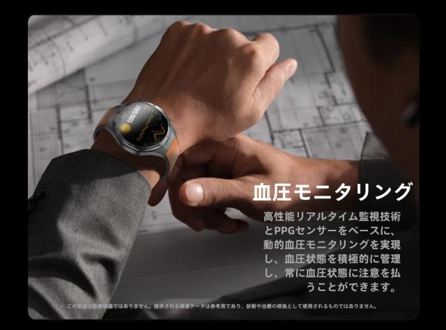 ・健康管理:体温監視、血圧測定、血中酸素、心拍計、活動量計、歩数計、音楽制御、座りがちの自動注意、睡眠モニター、運動モニター、スポーツ、カメラ操作、カロリー、睡眠の質と時間及び日常生活のさまざまなシーンで測定ができます。