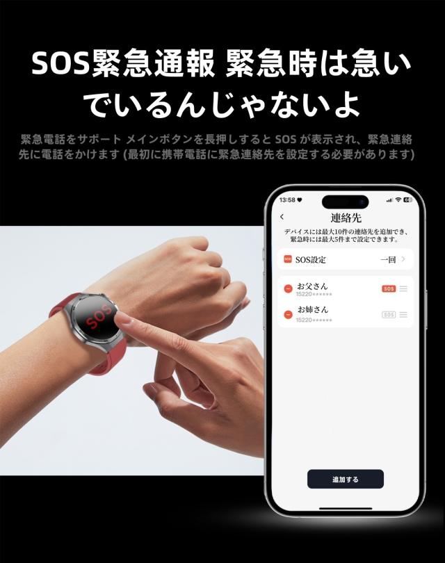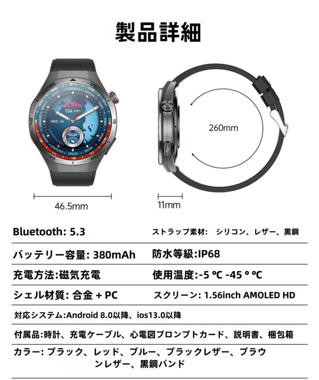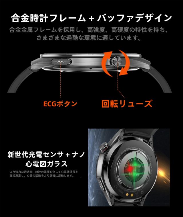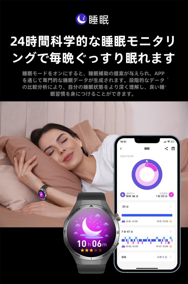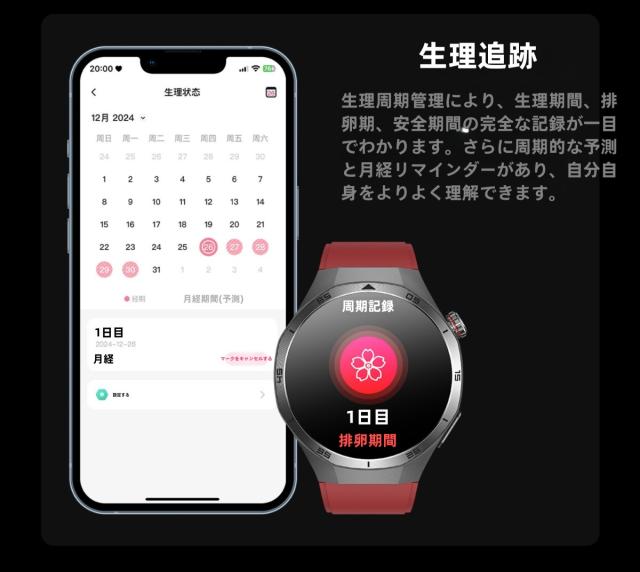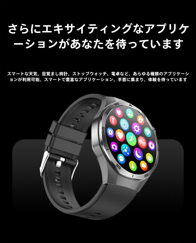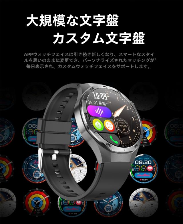 ・健康管理:体温監視、血圧測定、血中酸素、心拍計、活動量計、歩数計、音楽制御、座りがちの自動注意、睡眠モニター、運動モニター、スポーツ、カメラ操作、カロリー、睡眠の質と時間及び日常生活のさまざまなシーンで測定ができます。