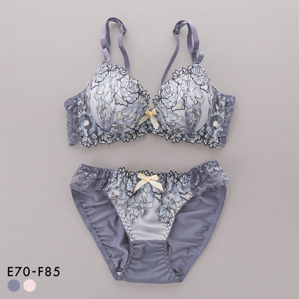 きらめくラメと光沢が美しいローズ刺繍がカップを埋めつくす、繊細で華やかなブラセット。胸中心には刺繍糸と色を合わせた大きなリボンをあしらい愛らしさをプラス。
