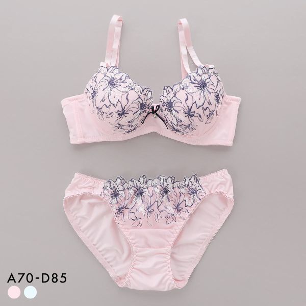 優美でなユリの花をフェミニンなカラーリングであしらった豪華なブラセット。カップを埋め尽くす花びらの刺繍に、ピンクは真珠のような光沢のオーロラ糸、ブルーグリーンはゴールドのラメ糸を使用し華やかに仕上げています。