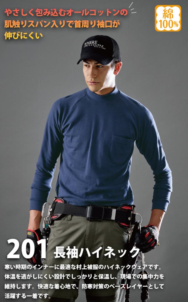 村上被服 秋冬 長袖ハイネック 201 HOOH 綿100% スムースニット オールコットン スパン入り 防寒着 メンズ ユニフォーム ワーク 作業着 作業服