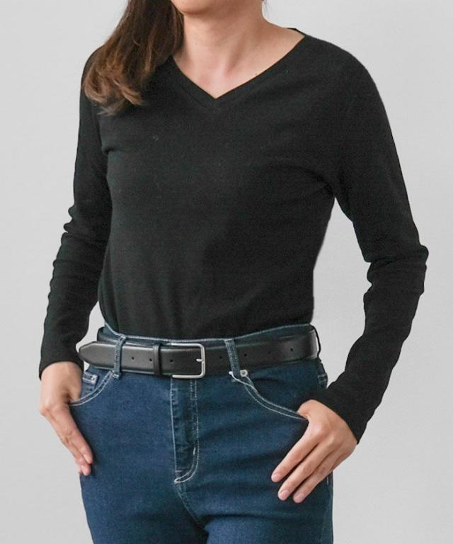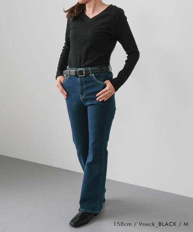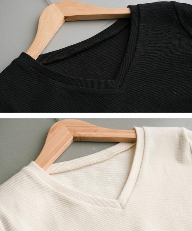 Vネックはフェイスラインをすっきり見せるシャープなスタイルに、
