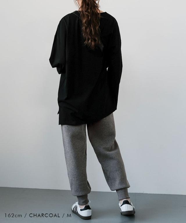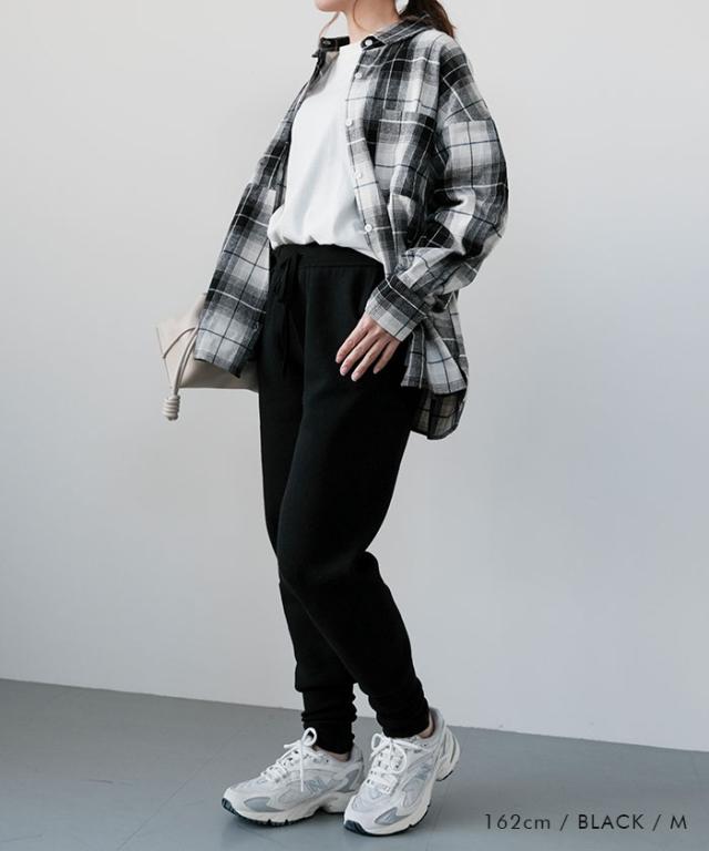 裾に向かってすっきりと絞られたシルエットが、だらしなく見せずにリラックスムードを演出します。