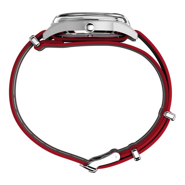 ヘサライト(Hesalite)製のドーム型クリスタルがケース全体を包み込み、タイメックスの名を刻んだ溝入りベゼルを覆うことで、レトロフューチャーな立体感と透明感を両立しています。
