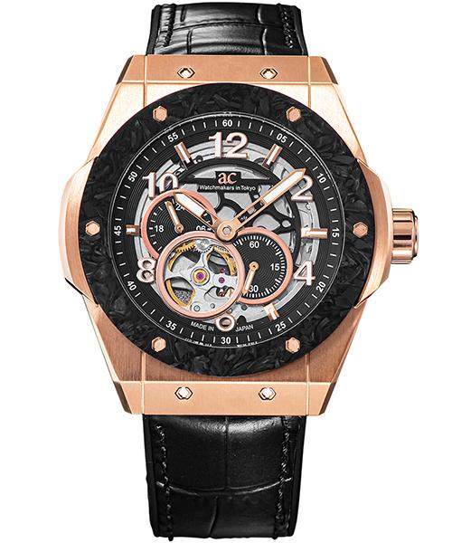 重厚感と立体感を兼ね備えたケースデザインに、高級スポーツカーを思わせるカーボンベゼルを組み合わせ、大人の腕元にふさわしい精悍でモダンな印象を与えます。