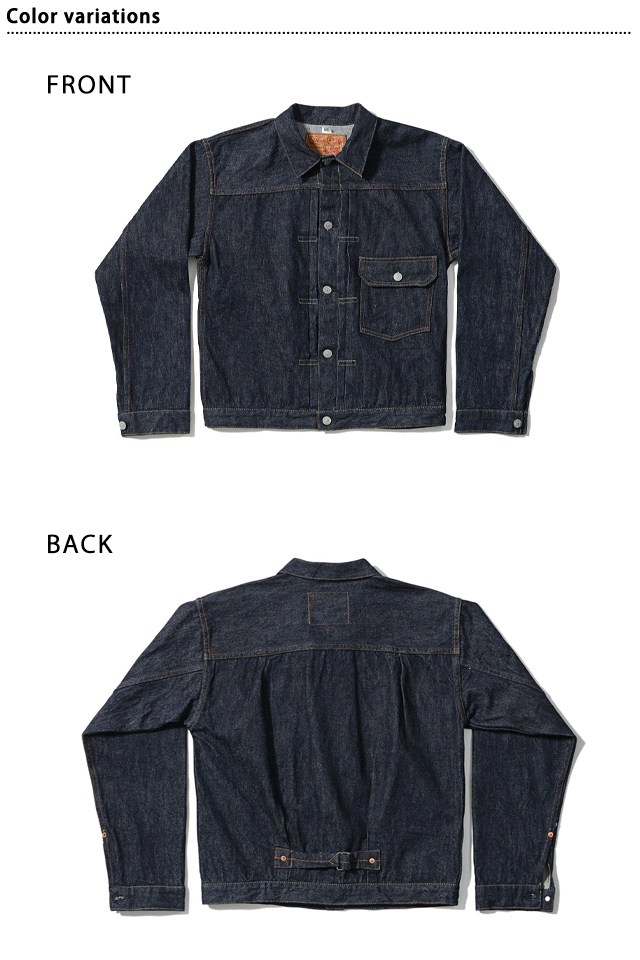 経糸7番×緯糸7番の未熟な紡績のムラ糸を使用した13.5oz.セルビッジデニムに、戦前らしいオレンジがメインのステッチワークが映えています。