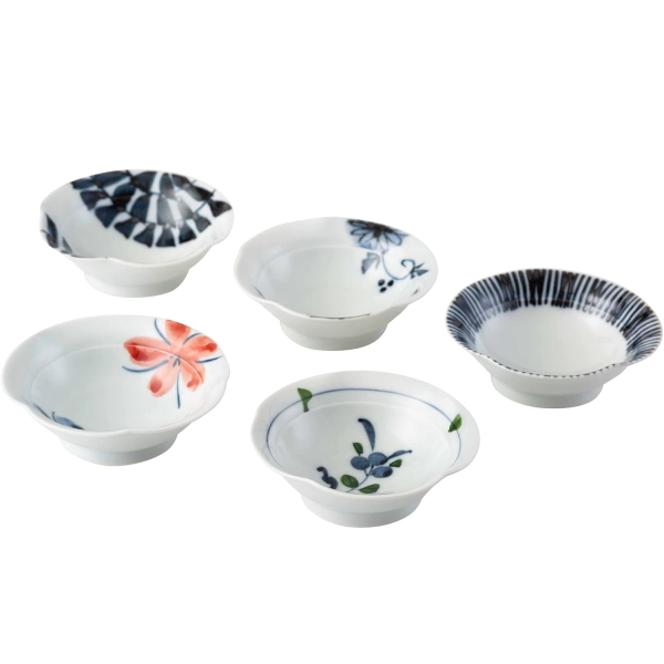 波佐見焼 古染絵変り なぶり小付揃 20602 5個、和皿、食洗器可、電子レンジ可、西海陶器、日本製、国産、化粧箱入、送料無料、和陶、十草、唐草、花絵、5柄、用途様々