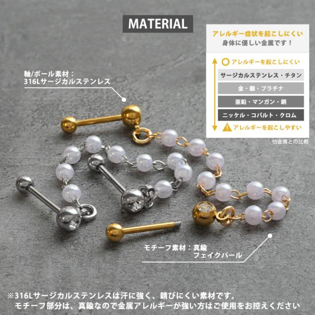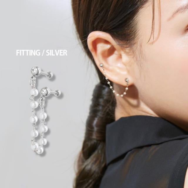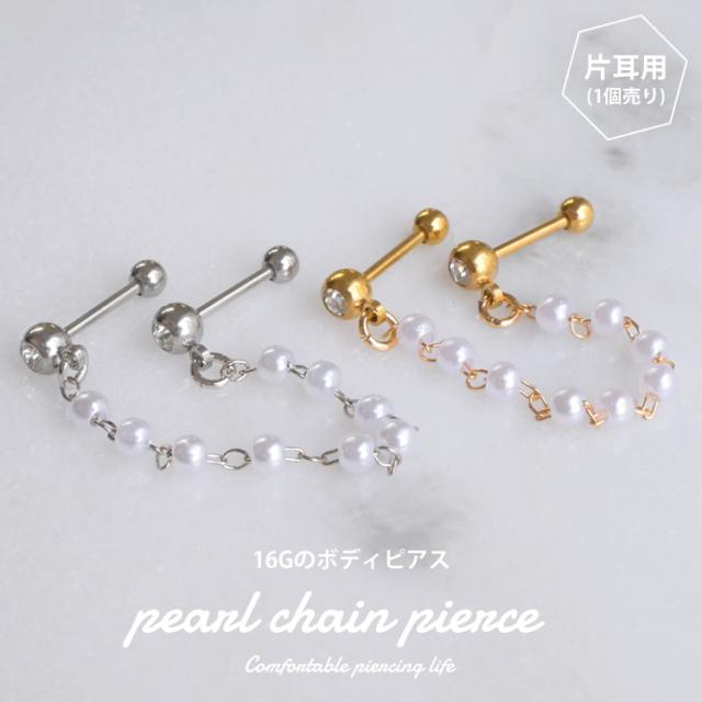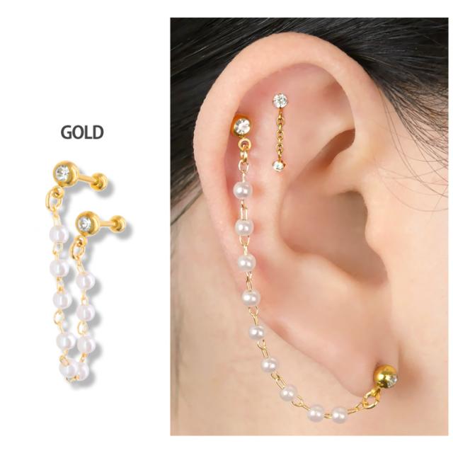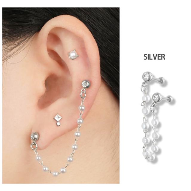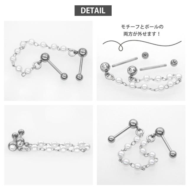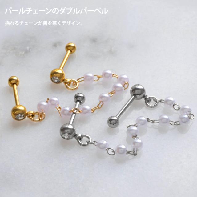 パールが連なったチェーンが存在感抜群なバーベルピアス。 2つのホールに着けてお使いいただけます。 耳たぶ同士でも、耳たぶと軟骨の組み合わせでも、自由にコーディネートを楽しめるアイテムです。 バーベルの太さはボディピアスのスタンダードサイズの16G。バーベルの軸部分とボール部分の材質はアレルギーが起きにくいサージカル(医療用)ステンレス素材なので安心です。