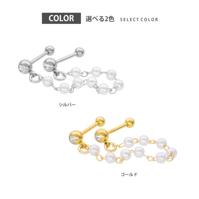 ボディピアス 2つのホールを繋げる ロングチェーン2連バーベル#パール 16G 軟骨ピアス【片耳用】【30日間お試し期間あり/返品交換保証】
