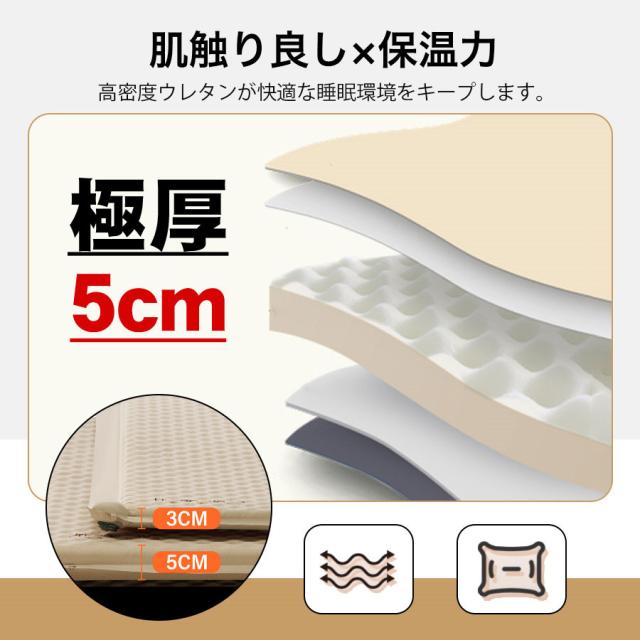 【寝心地も、持ち運びも。ちょうど良い厚さの“5cm”】キャンプでの眠りを快適にするため、キャンプ上のでこぼこや車内の段差が気にならない"5cm"の厚さにこだわりました。