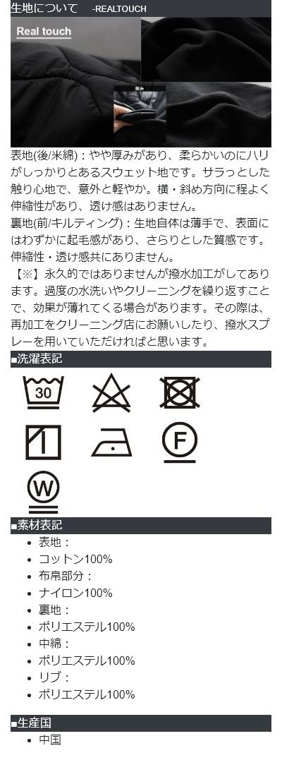 [素材]表地:コットン100% 布帛部分:ナイロン100% 裏地:ポリエステル100% 中綿:ポリエステル100% リブ:ポリエステル100%