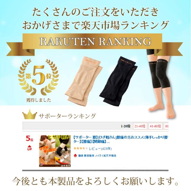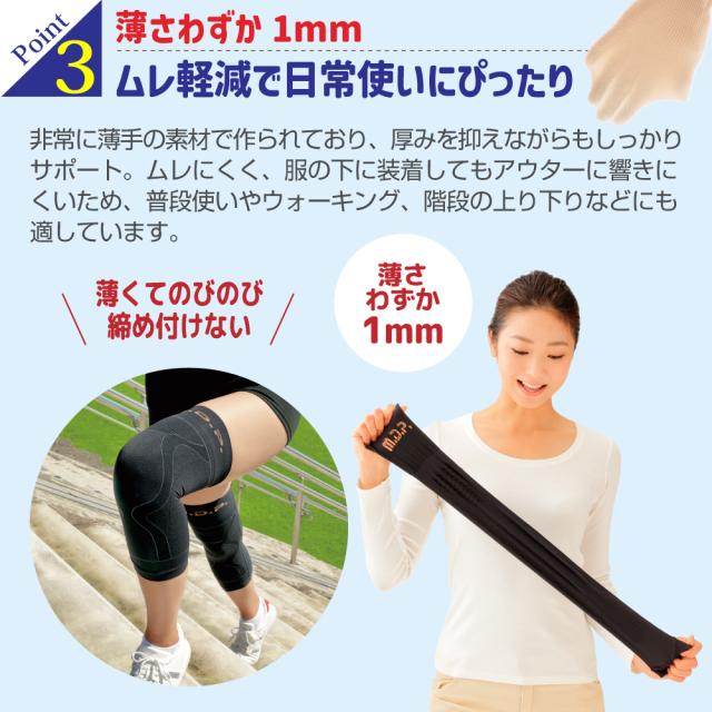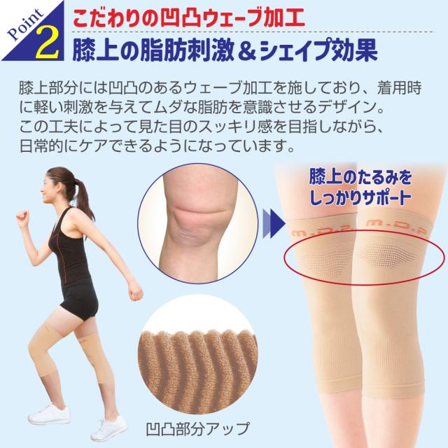 また、3段階圧力のサポートラインが膝を内側へ引っ張り、O脚による膝の痛みを緩和します。 凹凸ウェーブ加工により、気になる膝上のお肉をスッキリ。 薄手の膝サポーターなのでムレにくく、アウターにもひびきにくいのが特徴です。