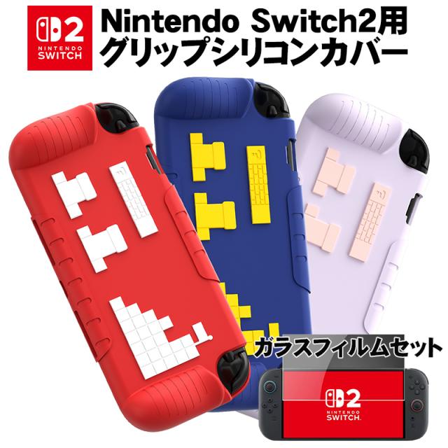 Switch2 専用 シリコングリップカバー ガラスフィルムセット Nintendo スイッチ2 グリップシリコンカバー 一体型 耐衝撃 傷防止 衝撃吸収 滑り止め加工 3カラー