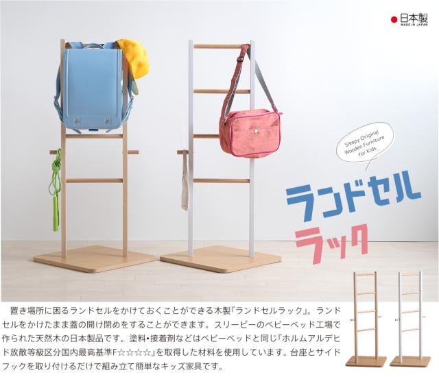 置き場所に困るランドセルをかけておくことができる木製『ランドセルラック』。ランドセルをかけたまま蓋の開け閉めをすることができます。スリーピーのベビーベッド工場で作られた天然木の日本製品です。塗料?接着剤などはベビーベッドと同じ『ホルムアルデヒド放散等級区分国内最高基準F☆☆☆☆』を取得した材料を使用しています。 台座とサイドフックを取り付けるだけで組み立て簡単なキッズ家具です。