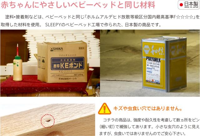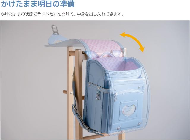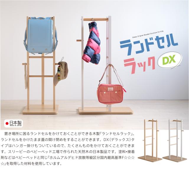 置き場所に困るランドセルをかけておくことができる木製『ランドセルラック』。ランドセルをかけたまま蓋の開け閉めをすることができます。DX(デラックス)タイプはハンガー掛けもついているので、たくさんものをかけておくことができます。スリーピーのベビーベッド工場で作られた天然木の日本製品です。塗料?接着剤などはベビーベッドと同じ『ホルムアルデヒド放散等級区分国内最高基準F☆☆☆☆』を取得した材料を使用しています。