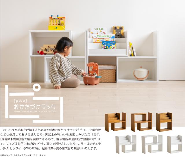 おもちゃや絵本を収納するための天然木おかたづけラック『ピコ』。化粧合板などは使用しておりませんので、天然木の味わいをお楽しみいただけます。【伸縮式】は無段階で幅を調節できるので、置き場所の選択肢が豊富になります。サイズはお子さまが使いやすい高さで設計されており、カラーはナチュラル(NA)とホワイト(WH)の2色。組立作業不要の完成品でお届けいたします。