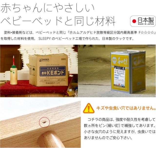 ベビーベッド工場がそのノウハウと材料を活かしてSLEEPYのベビーベッド工場で作られた、天然木の日本製折りたたみハンガーラック。サイズはちょっと小さめのキッズ用です。木目の美しいヨーロッパ産の天然木(ブナ材)を使用しており、塗料?接着剤などは、ベビーベッドと同じ『ホルムアルデヒド放散等級区分国内最高基準F☆☆☆☆』を取得した材料を使用しています。