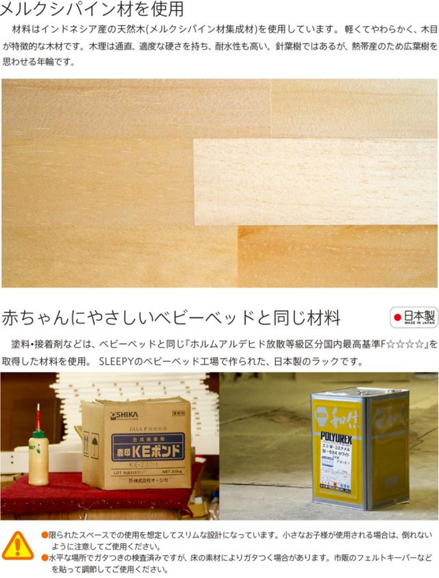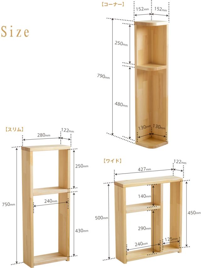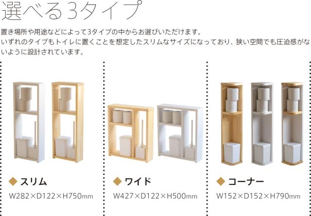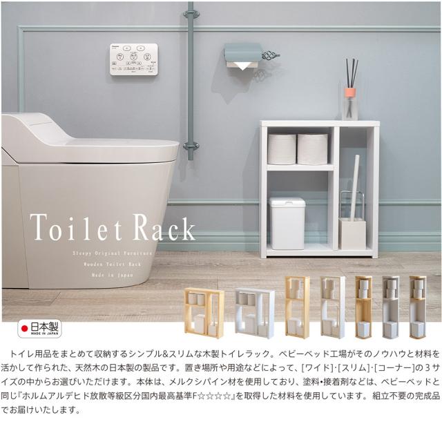 トイレ用品をまとめて収納するシンプル&スリムな木製トイレラック。ベビーベッド工場がそのノウハウと材料を活かして作られた、天然木の日本製の製品です。置き場所や用途などによって、[ワイド]・[スリム]・[コーナー]の3サイズの中からお選びいただけます。本体は、メルクシパイン材を使用しており、塗料?接着剤などは、ベビーベッドと同じ『ホルムアルデヒド放散等級区分国内最高基準F☆☆☆☆』を取得した材料を使用しています。 組立不要の完成品でお届けいたします。