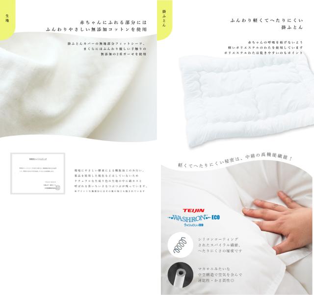 | サイズ | 掛ふとんカバー 約90×120cm ヌード掛ふとん(厚) 約85×115cm 重量:約0.4kg フィッティングシーツ 約70×120cm 洗える敷ふとん(固綿マット) 約70×40×厚み4cm 3枚(3枚並べると約70×120cmになります) 敷ふとんカバー 約73×123cm 王冠まくら約25×25cm |