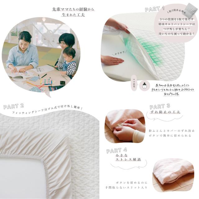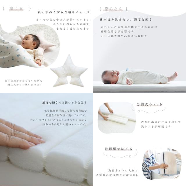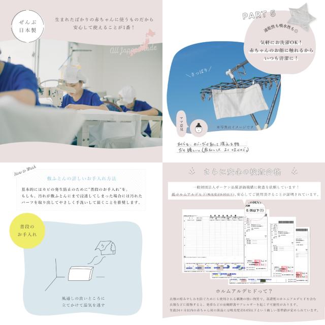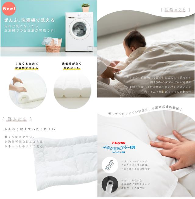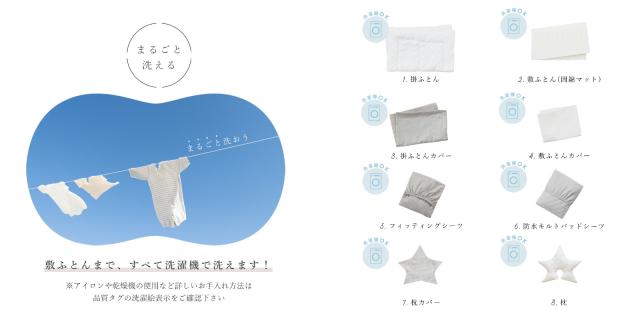 | お手入れ方法 | ※洗濯機でお洗濯する場合は洗濯ネットをご使用の上、弱いコースをご選択ください。 掛ふとん 洗濯機可、タンブラー乾燥・アイロン不可 敷ふとん(固綿マット) 洗濯機可、タンブラー乾燥・アイロン不可 掛ふとんカバー 洗濯機可、タンブラー乾燥不可 敷ふとんカバー 洗濯機可、タンブラー乾燥・アイロン不可 フィッティングシーツ 洗濯機可、タンブラー乾燥不可 防水キルトパットシーツ 洗濯機可、タンブラー乾燥不可・アイロン不可 おくるみケット 洗濯機可、タンブラー乾燥不可 枕カバー 洗濯機可、タンブラー乾燥不可 枕 洗濯機可、タンブラー乾燥不可・アイロン不可 |