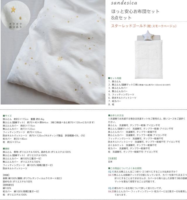 sandesica(サンデシカ) ほっと安心お布団セット 8点セット スターレットゴールド/枕:スモークベージュ・レギュラーサイズ ベビー布団 日本製