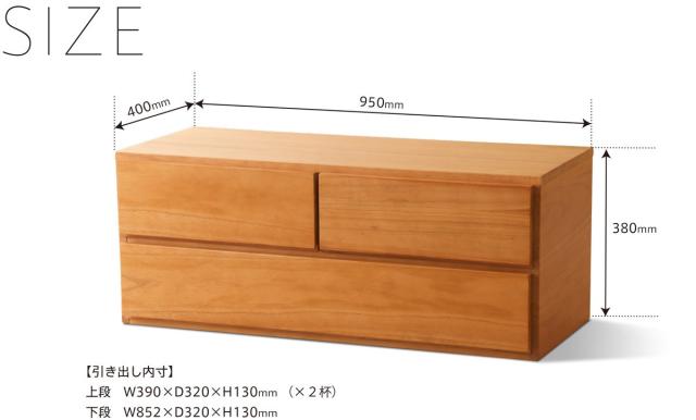 | サイズ | W950×D400×H380mm (上段引き出し内寸) W390×D320×H130mm(×2杯) (下段引き出し内寸) W852×D320×H130mm |