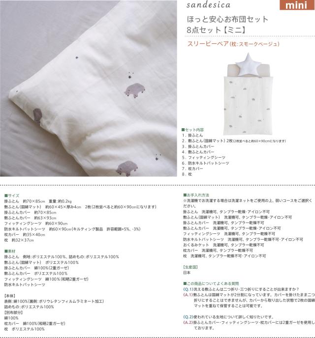 sandesica(サンデシカ) ほっと安心お布団セット 8点セット スリーピーベア/枕:スモークベージュ・ミニサイズ ベビー布団 日本製
