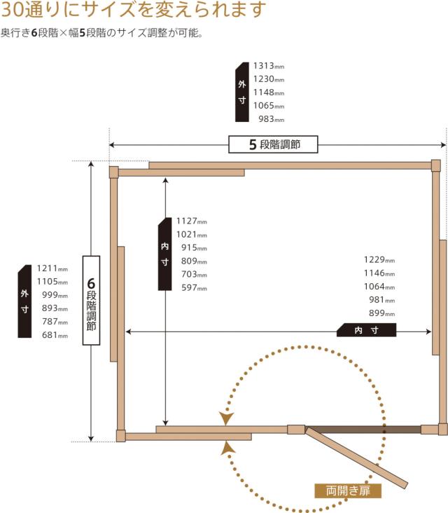 | サイズ | 本体:W(5段階)1313、1230、1148、1065、983 × D(6段階)1211、1105、999、893、787、681×H655mm 内寸:W(5段階)1229、1146、1064、981、899 × D(6段階)1127、1021、915、809、703、597mm 扉幅:364mm |