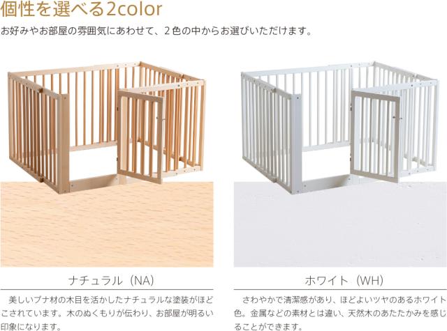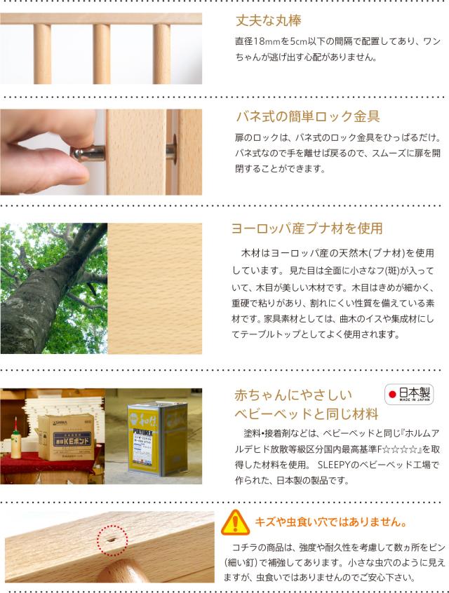 枠だけではなく柵の部分も天然木(ブナ材)を使用したシンプル設計ながら、幅や奥行きもサイズ調整可能な日本製の木製ペットサークルです。扉も奥と手前の両方向に開くことができるので、左右どちらにも扉を配置することができます。カラーはナチュラル(NA)とホワイト(WH)の2色。ベビーベッドと同じ材料と技術を使ってスリーピーの日本工場で製造されています。赤ちゃんにも安心なので、ペットにもやさしい。そんな天然木ペットサークルに仕上がっています。