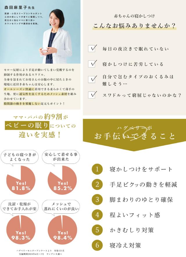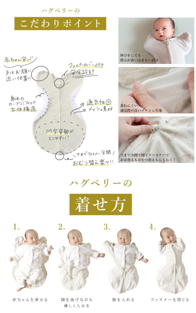 《Q.2》赤ちゃんは窮屈ではないですか? 《Q.3》何ヶ月から使い始められますか? 《Q.4》どのタイミングに着せますか? 《Q.6》Hug Bellyを使用しても寝ない時は? 《Q.6》ダブルファスナー仕様でしょうか? |