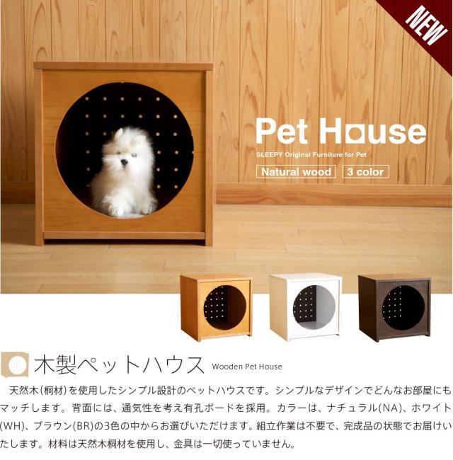 天然木を使用したシンプル設計のペットハウスです。シンプルなデザインでどんなお部屋にもマッチします。背面には、通気性を考え有孔ボードを採用。カラーは、ナチュラル(NA)、ホワイト(WH)、ブラウン(BR)の3色の中からお選びいただけます。 組立作業は不要で、完成品の状態でお届けいたします。材料は天然木(桐材)使用し、金具は一切使っていません。
