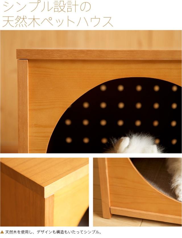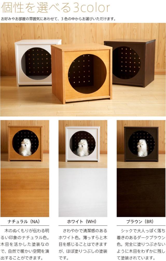 天然木を使用したシンプル設計のペットハウスです。シンプルなデザインでどんなお部屋にもマッチします。背面には、通気性を考え有孔ボードを採用。カラーは、ナチュラル(NA)、ホワイト(WH)、ブラウン(BR)の3色の中からお選びいただけます。 組立作業は不要で、完成品の状態でお届けいたします。材料は天然木(桐材)使用し、金具は一切使っていません。