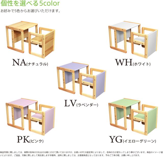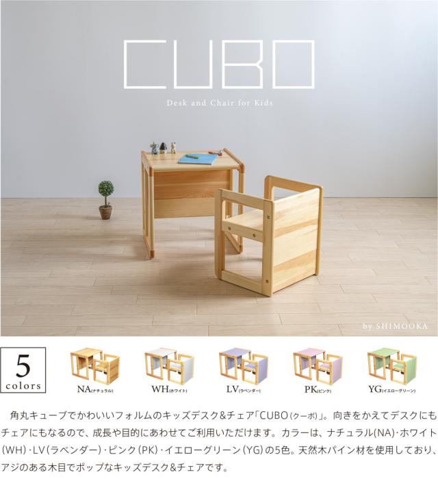 角丸キューブでかわいいフォルムのキッズデスク&チェア「CUBO(クーボ)」。向きをかえてデスクにもチェアにもなるので、成長や目的にあわせてご利用いただけます。カラーは、ナチュラル(NA)・ホワイト(WH)・LV(ラベンダー)・ピンク(PK)・イエローグリーン(YG)の5色。 天然木パイン材を使用しており、アジのある木目でポップなキッズデスク&チェアです。