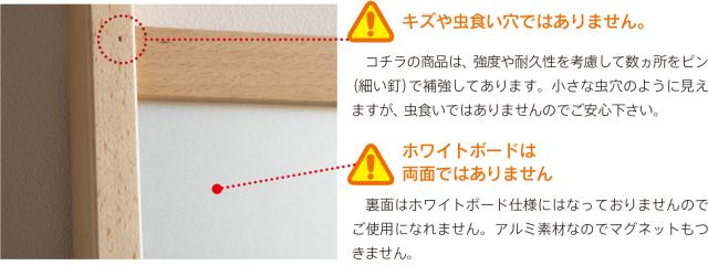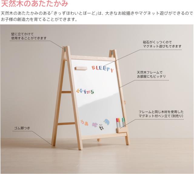 | 特 徴 | 「お絵描き」や「マグネット遊び」ができる、天然木フレームのキッズ用ホワイトボード。お子様が大きくなったら壁に立てかけて学校のお知らせを貼ったりメッセージボードとして使用することもできます。フレーム部はスリーピー製のベビーベッドと同じ木材(天然木ブナ材)を使用し、『ホルムアルデヒド放散等級区分国内最高基準F☆☆☆☆』を取得の塗料?接着剤を使用した日本製のホワイトボードです。 ※ホワイトボードマーカーやマグネットは付属しておりません。 |