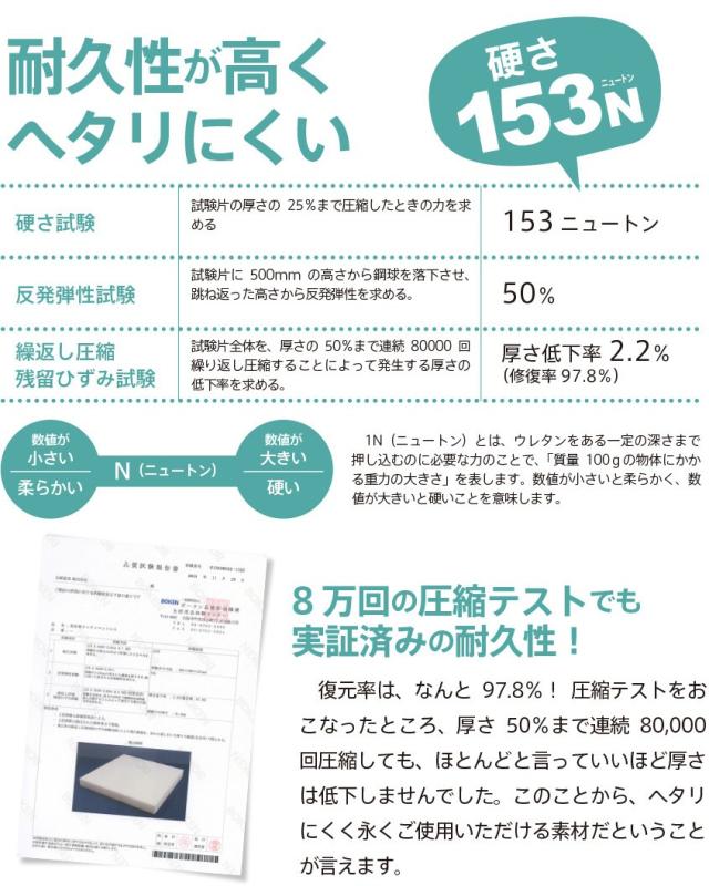 | 高密度高弾性ウレタンフォーム(密度35kg/) 硬さ:153N(ニュートン) 外地: 床面・指定外繊維(テンセル) 側面・ポリエステル100%(4Dメッシュ) 生産国:中国 |